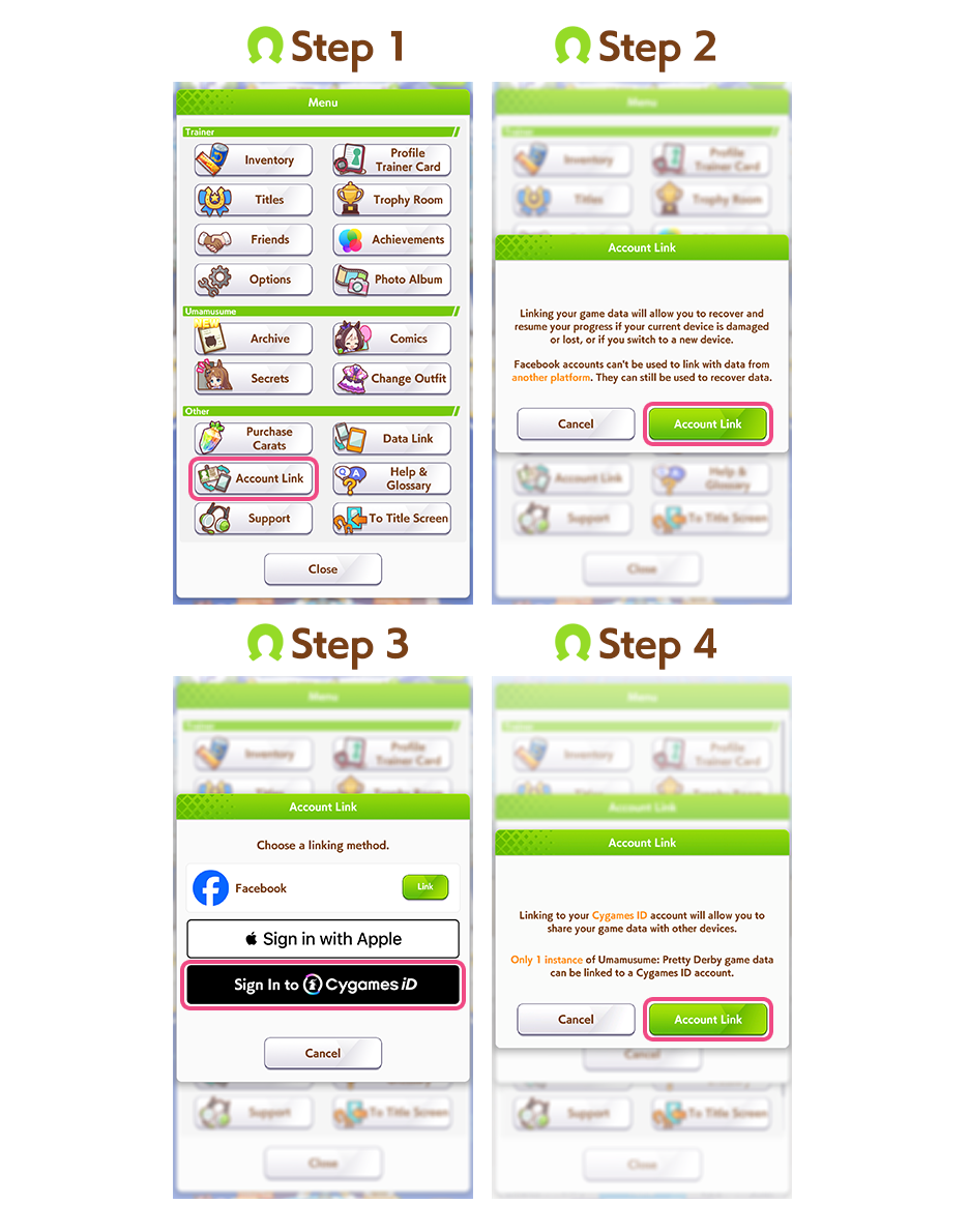 1. In the Umamusume: Pretty Derby app, open the menu from the Home screen, then tap "Account Link."